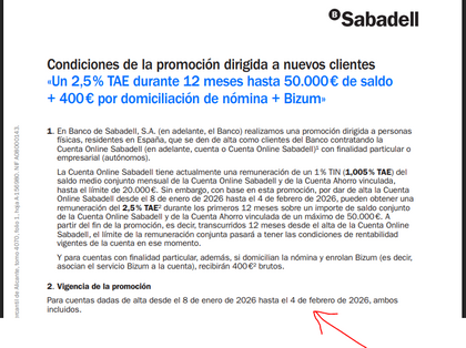 Re: Promoción Cuenta Online Sabadell. 300 €, 2,5% TAE y 3% en recibos. ¡FIN DE PROMOCIÓN! Hasta el 31/01/25