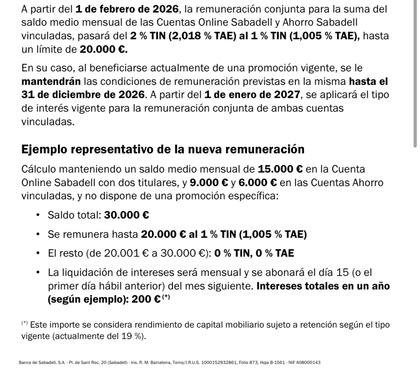 Hola, tengo la cuenta del Sabadell con la promoción desde diciembre 2024. Con un interés del 2,5 hasta 50.000 euros. Me mandaron el correo de que cambiaba la remuneración a partir de febrero pero que me mantenían las condiciones de la promoción hasta 31/12/2026. Me mantendrán el 2,5? Hasta 50000 o hasta 20000? Adjunto foto del correo.