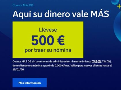 "Si no se cumplen las condiciones, la TAE de la cuenta nómina más DB será del -4,714%. Está TAE se aplicará si de mantiene un saldo diario de 5k (inferior a los 10k requeridos en el punto 4.2) durante un año y se ingresan menos de 2k mensuales por nómina. Se aplicará un TIN anual del 0% y se cobrará una comisión de mantenimiento trimestral de 60€ (240 anuales).