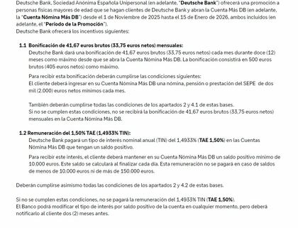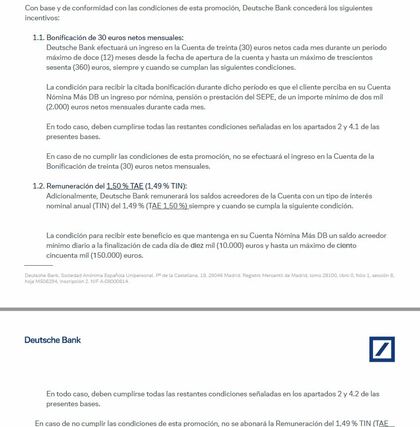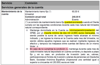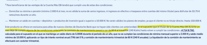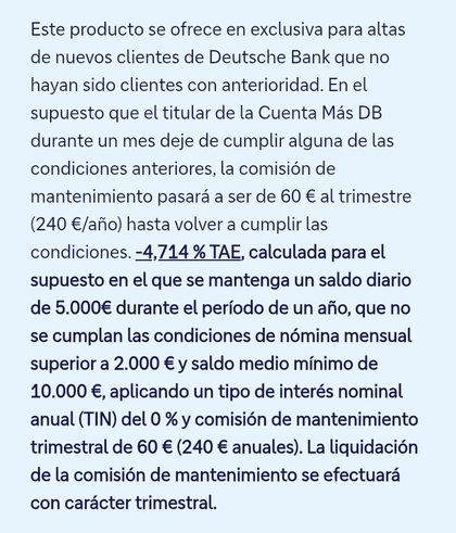 Si no se cumplen las condiciones: La TAE de la Cuenta Nómina Más DB será de -4,714%. Esta TAE se aplicará si se mantiene un saldo diario de 5.000 € (saldo inferior a los 10.000 € requeridos en el punto 4.2 anterior) durante un año y se ingresan menos de 2.000 € mensuales por nómina. Se aplicará un TIN anual del 0% y se cobrará una comisión de mantenimiento trimestral de 60 € (240 € anuales). La comisión de mantenimiento se cobrará cada tres meses