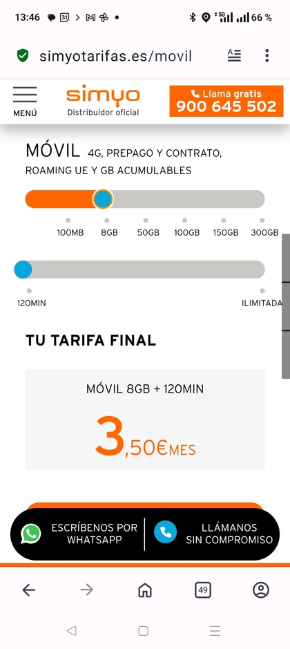 MÓVIL 8GB + 120MIN 3 ,50€mes