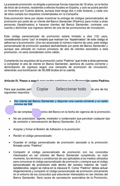 Me ha llamado el director de oficina de Santa de mi localidad para darme la bienvenida… y decirme que, para ser considerada “cliente activo”, debía de tener un mínimo de 30€ en la cuenta durante 2 días seguidos. Le he dicho que los tendría sin problema, pero que en las BBLL no lo había visto… a lo que me ha dicho que no consta, pero que venía a ser “una norma propia” (¿perdón?).