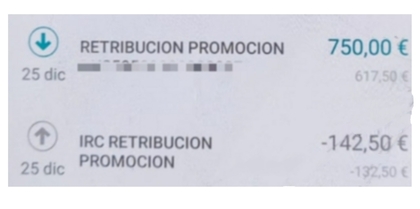 Eso fue el 23/12 y el 25/12 recibí incentivo de 750€ menos retención. El 29/12 envié el tint0 cruzado desde DB que llegó el mismo día intradía.
