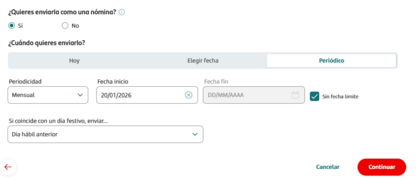 Por ejemplo si quieres que la transferencia sea mensual todos los días 20 de cada mes , dejas la periodicidad mensual que es la que sale por defecto, fecha inicio 20/01/2026 y o bien dejas sin fecha límite que es lo que aparece por defecto o pones la fecha límite que quieras.