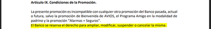 La presente promoción es incompatible con cualquier otra promoción del Banco pasada, actual o futura, salvo la promoción de Bienvenida de AVIOS, el Programa Amigo en la modalidad de padrino y la promoción “Alarmas + Seguros”.