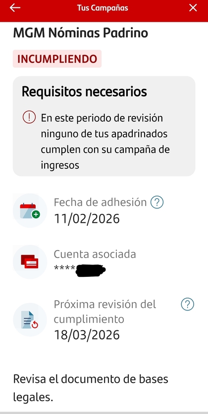 Veo por tanto, que aunque a ambos nos pone en la campaña "INCUMPLIENDO", eso es debido a que aún estamos en el período de cumplimiento de las condiciones, que es hasta el día 7 de marzo. Y aunque yo como ahijado ya he cumplido con mi parte: el ingreso recurrente (600 euros) y los dos recibos (he hecho dos de PP por 0,1 euros, y por si acaso dos de Teaming que todavía no me han cargado), por lo que dices hasta el 12/13 de marzo no me abonarán el incentivo de los 300 brutos, y al padrino el día 18 los 80 euros. Quizás he sido un poco cagaprisas🤣.