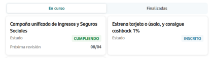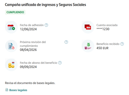TUS CAMPAÑAS: CAMPAÑA DE INGRESOS Entramos dentro y podemos consultar si estamos cumpliendo junto a más información interesante como la próxima revisón, fecha de adhesión, fecha de abono del incentivo, importes e incluso descargas las Bases Legales de nuestra promoción.