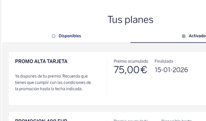 Buenas @ravel pues alli me pillas.....es q recientente me di cuenta q tengo activada: PROMO ALTA TARJETA (q no me acuerdo de q era) con premio acumulado de unos 2€ y q finalizaba el 18/01/2026 (sabiendo q tengo finalizadas en agosto y cobradas las del CASHBACK T.C y la del AHORRO EN NOMINA. Gracias