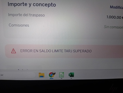 Vaya lo que me faltaba 🤣, no me deja traspasar más dinero de mi cuenta BBVA a la tarjeta. Osea ya no solo no me deja incrementar el limite máximo establecido de 600 eur, sino que no me deja traspasar más de la cuenta a tarjeta, éste mes de febrero solo había traspasado 1400 eur.