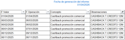 Una cosa que me ha pasado por 1.ª vez Estoy con la promo 2% 12 meses desde el momento del alta. El CB siempre lo abonaron con fecha valor días 6 (fuesen hábiles o no, como el 6 de diciembre y el 6 de enero que eran inhábiles; festivos nacionales), pero este mes (la excepción) lo han hecho con fecha valor (también operación) en el día de hoy, día 1: ¿Qué ha pasado? Que ayer, 31mar, 'inyecté' fondos (traspaso) desde la cuenta hacia la TC y ésta quedó con saldo positivo de modo que este mes de abril no me adeudarán nada por lo gastado con la TC en el mes de marzo, como así consta en el extracto de la TC que desde hoy está disponible en el Buzón de la app y web.