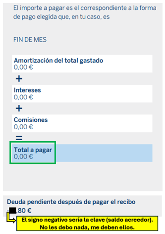 Ha sido una especie de carambola, no buscada. Es que ayer tenía que hacer un pago que estimaba superior a los 100 € con la TC (tema veterinario) y previamente (un par de horas antes de que nos recibiese el veterinario), pasé dinero de la cuenta a la TC. El cargo del veterinario fue ayer, y también ayer -pero previamente- el traspaso de cuenta a TC, y... ¿qué ha pasado? Pues que el traspaso me entró en la liquidación de la TC del mes de marzo, y por eso nada tengo que pagar el 05abr, pues el gasto por veterinario se consolidó como gasto del mes de abril, como si fuese pago en abril pese a pasar la TC por el TPV en el día de ayer. No sé si me explico...