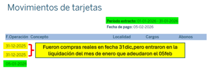 A ver si el descuadre tuviera que ver con operaciones del último día de mes, ya que podría ocurrir, y pasa a menudo, que compras el último día de un mes figuran en el extracto del mes siguiente. Por ejemplo, caso real: Para tus cálculos 2% habría que tomar los importes de compras, válidas, que veas en el extracto mensual de movimientos de la TC; extractos donde ya advierten de que se toman las operaciones procesadas en cada periodo de liquidación: A ver si por ese camino pudieras 'cuadrar' esos CB del 2% que, como ya te han comentado, no tiene retención fiscal, ni figura en los datos fiscales que la entidad aporta a Hacienda.