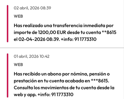 Por cierto, me acaba de llegar la notificación de la transferencia, pero la de nómina aún no. La verdad es que es una castaña este sistema que tienen, vuelve loco a cualquiera, con lo visual y sencillo que aparece en el resto de bancos...