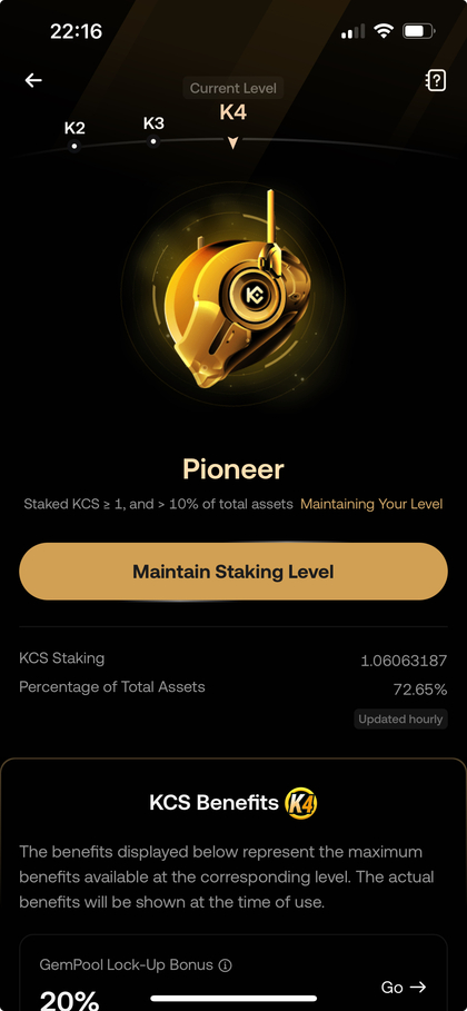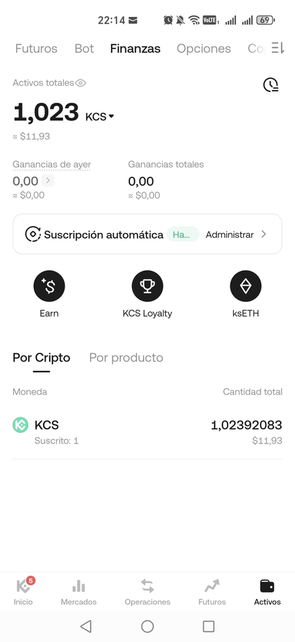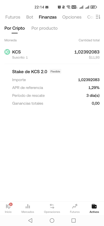 Si has comprado un token de protocolo (KCS) y lo has puesto a hacer staking, no has hecho nada mal. Andan por los 11€ creo.