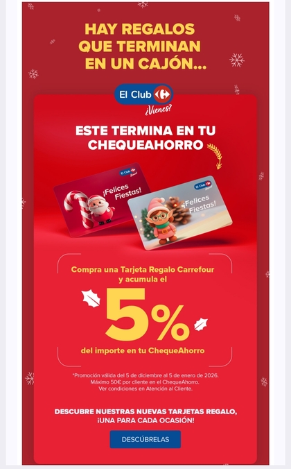 #1951 Re: TARJETAS promociones y cashback Ver mensaje de berebere marimari Seguir 11/12/25 08:54 carrefour da un 5% en el cheque ahorro por la compra de tarjetas regalo, hasta 50 en cheque ahorro. Por si interesa. Responder