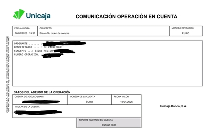 Para el Cashback de Unicaja por uso de Bizum, del 5% máximo 100 euros, he liberado crédito con pago fácil de CF de una recarga en RV mediante la Pass, y en el recibo me ha salido: concepto "Bizum pedido xxxxxx". Entiendo que me vale para el Cashback. Así que voy a ir a full a por el máximo de los 100 euros: en cuanto se me asiente la liberación de crédito en la Pass (por experiencia tarda unas 48 horas), repetiré la operación has completar 2000 euros de gasto y obtener el máximo de Cashback. Creo que me da tiempo antes del 31 de enero que acaba la promo.