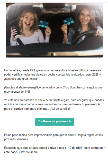Hola. He recibido email de Ciclogreen. Ya empiezan a pagar y yo he canjeado mis 14 euritos que hice en coche compartido en 2025.