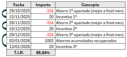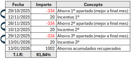 Totalmente de acuerdo. Además, en términos TIR se podría hablar de una rentabilidad superior al 86% En el siguiente ejemplo se supone que se aparta el dinero a finales de mes, para tenerlo el menor tiempo inmovilizado, y que ya el 2-ene-26 se pueden retirar los 1.002 € por los 3 meses de ahorro acumulados, pues entiendo que ello no impide el derecho a cobrar días después los últimos 20€ por lo ahorrado, hecho consumado, en diciembre. Incluso para más conservadores, que prefieren no retirar los ahorros acumulados hasta que hayan cobrado el incentivo 3º y último, hablaríamos de TIR superior al 61%: