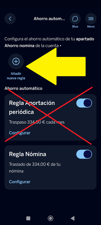 Es curioso porque a mi mujer sí he podido configurarlo siguiendo tus pasos pero en mi caso, no aparece la opción "Regla nómina" al acceder al ahorro automático, solo hay una "Regla de aportación periódica".