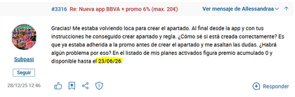 Gracias! Me estaba volviendo loca para crear el apartado. Al final desde la app y con tus instrucciones he conseguido crear apartado y regla. ¿Cómo sé si está creada correctamente? Es que ya estaba adherida a la promo antes de crear el apartado y me asaltan las dudas. ¿Habrá algún problema por eso? En el listado de mis planes activados figura premio acumulado 0 y disponible hasta el 23/06/26.