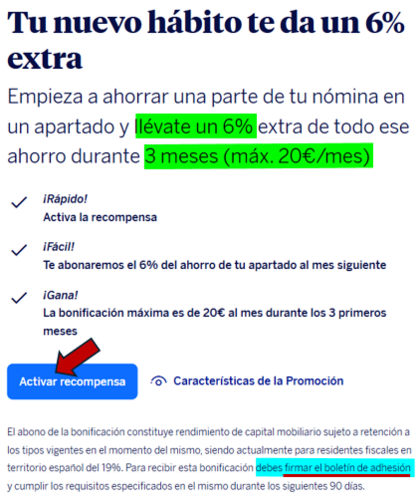 Diría que nunca te impedirán crear una regla (automática) de ahorro, pero ello no significa necesariamente que te permitan apuntar, adscribirte, a la promo (extinta, o deshabilitada temporalmente, parece ser...) del 6%. En su momento me salió esto, incluso antes de que aterrizase en la cuenta la 1.ª n0m1n4: Luego, al email llegó adjunto, fichero PDF, el boletín de adhesión propuesto que, al firmarlo, generó otro email con el mismo boletín pero ya firmado (firma electrónica que consta, con fecha dd/mm/aaaa hh:mm:ss, únicamente a pie de página y únicamente en la última página del boletín). No parece que ahora mismo estén ofreciendo esa misma promo... por lo leído recientemente