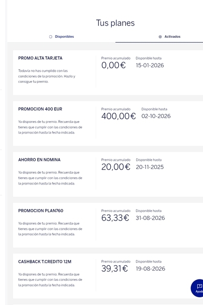 Hola de nuevo. Hoy ya me aparece el abono de la promo 760. Tb estoy cobrando el 2% casback tarjeta aqua mas. Tb el 6% hasta 20€ mes durante 3 meses del ahorro apartado nómina. El casback del 5% hasta 25€ mes durante 4 meses supongo lo abonarán el 15, ya que empieza a contar desde que se activa la promo. Los 400€ de nómina colectivos ya aparecen. Seguiré informando.