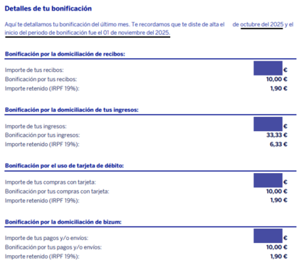 A la 760 me metí en octubre. Veo ahora en el buzón virtual de correspondencia un documento descargable disponible desde el pasado 2-dic: Que me ha resultado muy interesante pues aparecen los importes reales (tapados con rectángulos azules en la captura siguiente) por los 4 conceptos bonificables que incluye esta promo. Por si alguien no mirase su buzón muy a menudo y pudiese interesarle descargar estos datos que, entiendo, seguirán enviando mensualmente.