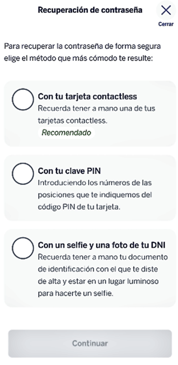 No sé si tendrá algo que ver lo que voy a decir ahora, para que salgan más opciones de desbloqueo en la app... Como tenía el IBAN de su cuenta, la del familiar, estando su acceso bloqueado hicimos todo esto: