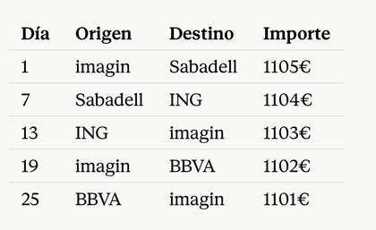 Gracias, si es así parece que todo irá bien. ¿En BB.VA, hay que dejar dormir unos días el dinero de la nómina antes de poder sacarlos? En IeNeG he visto que solo es necesario que esté un día. Mi idea es programar todas las transferencias (normales y tintos) para poder hacer varias promos sin tener que hacer nada durante los 12 meses y siempre con el mismo dinero. Usaré Imagin para los tintos. Como ves la idea/planificación? He contado con margen por los festivos que caen en viernes o lunes. Los importes son diferentes para ir dejando al menos 1€ en cada sitio.