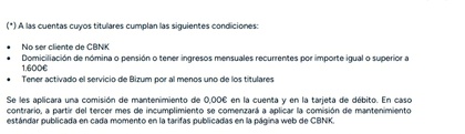 Por otro lado, he visto en la propia web del banco, que cobran 15 € de mantenimiento anual de la tarjeta de debito a noser que cumplas una serie de condiciones, si no las cumples y teniendo en cuenta que hay que estar 24 meses, tocaria pagar 30 €