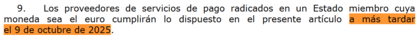 Aunque ahora mismo no permitan inmediatas de salida, a partir del 9 de octubre de 2025 (fecha tope) será obligatorio para todos los proveedores de servicios de pago (bancos) de la Unión Europea que ofrezcan transferencias inmediatas en euros, tanto de emisión o salida como de recepción o entrada, de acuerdo con el Reglamento (UE) 2024/886.