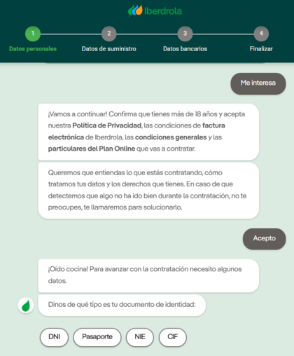 He seguido los pasos de Reich, he llegado al chatbot y he finalizado la contratación:
