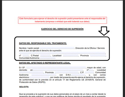 Para solicitar la supresión, rellenas el siguiente formulario (descargable desde la página de la Agencia Española de Protección de Datos) y lo envías adjuntando el DNI a: