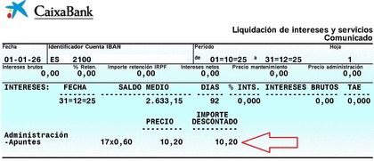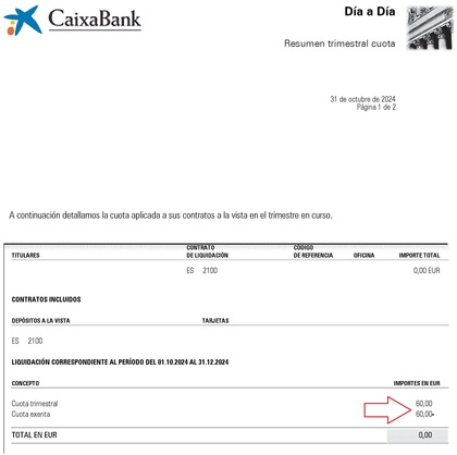 Ya era conocido que Caichabank facturaba 60€ de cuota trimestral "Día a Día" a la que luego le hacían exención. Acabo de ver un nuevo tipo de comisión por apunte a la que también aplican exención. Huele a que están preparando los sistemas para pruebas y en algún momento fundir a los clientes activando todas las comisiones a la vez. Nunca ví esto de comisiones por apunte, en este caso de 17 apuntes durante el trimestre a 0,60€ cada uno. Además meten esto de intereses brutos y tal como si fueran a pagarlos en un futuro.