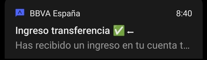 Pues bien, me ha llegado de forma immediata (como en vvba), y sale tipificado como "nómina buena" exactamente igual que cuándo las lanzaba desde Cantabria (todo exactamente igual, con las monedillas, abono nómina, etc.) peeero, en la notificación PUSH no me ha salido que era nómina sinó transferencia normal, y eso me mosquea porque salen dos notis, la de transfe y la de enhorabuena ha llegado tu nómina (y esta última no está)