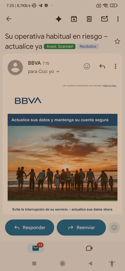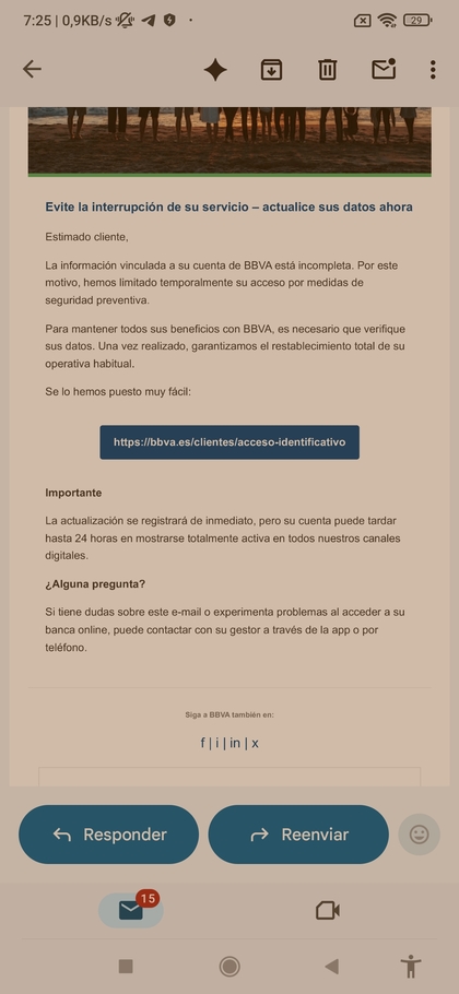#1 Phising - Cuenta online BBVA fcuevas32 Seguir 23/03/26 07:33 Acabo de recibir este email, andad con ojo... Email fake 2 parte 3 parte 2 Responder