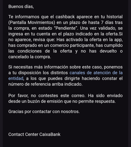 #31 Re: Devolución 5% al volver a utilizar la tarjeta Imagin Khito Seguir 10/04/26 15:47 A mí me han respondido algo parecido... En fin. Y eso que les reenvié el correo para que no hubiera duda de a qué me refería. Responder