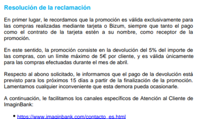 Los bancos luego no te perdonan ni un solo euro cuando comentes un error, aferrándose a las condiciones estipuladas por contrato/comisiones, pero ellos bien que cambian la película cuando quieren a su antojo: dijeron claramente en el correo que en máximo 48/72 horas se hacía el abono/devolución de la promo, y ahora dicen que 15 días después de no sé qué fecha (sin especificar) en la que finaliza la promoción... Surrealista total, macho.