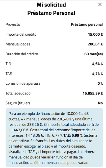 Pues aunque parezca raro nunca he tenido que pedir un préstamo personal pero siempre hay una primera vez. Estoy a la búsqueda de un pequeño préstamos de 15.000 euros a devolver entre 48 y 60 meses... pero me encuentro en que todas las publicidades no son correctas una vez estudian mi "historial" y me salen prestamos alrededor de un 10% TAE....