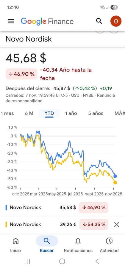 #137089 Re: Farmas USA Ver mensaje de framus_morrigan Pervius Seguir 09/11/25 12:46 Novo nordisk comparacion valor en usa, o comprar en euro en el xetra, sabeis cual es el motivi de la diferencia , el cambio euro dolar???, o el grafico esta mal??Basicamete dice que hubuera sido menos malo comprar en dolares a principio de año b Responder