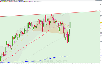 Russell 2000 - IWM . velas 2 semanas, la actual termina la proxima semana el movimiento tras el breakdown de la cuña sigue su curso ...