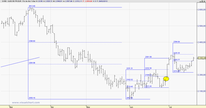 Pues creo que ahora toca ser Bajista. Si se pierden los 2200, perdida de Directriz Alcista, posteriormente cierre del hueco y no me extrañaría ver la vuelta al origen al movimiento.