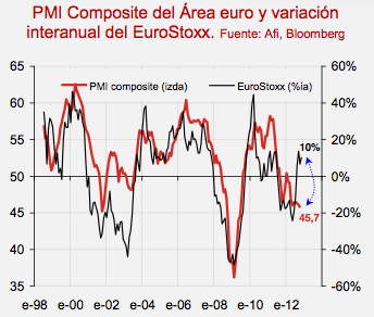 Recordamos que los PMIs son unas encuestas que se hacen al sector manufacturero y de servicios. Una lectura inferior (superior) a 50 recoge una actividad del sector en contracción (expansión). El PMI composite, tal como su nombre indica, es una media de los resultados de los PMI de manufacturas y servicios. Este PMI composite también se han publicado hoy (45,7) y encadena 9 meses consecutivos por debajo de 50.