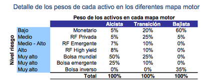 Diseñamos tres “curvas de potencia”: alcista, transición y bajista. Así, por ejemplo, un mapa alcista pasa por una fuerte exposición a áreas de mercado que mejor pueden capitalizar este entorno alcista, como puede ser la renta variable. En la tabla inferior detallamos la composición de cada mapa motor.