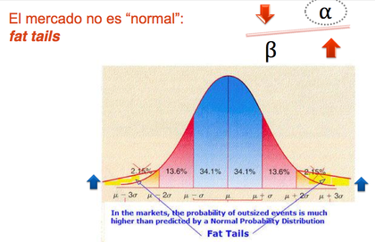 Cuando analizamos la distribución de rendimientos en los mercados de acciones nos encontramos con una distribución que no cumplen los requisitos de normalidad. Los riesgos de cola, eventos que se sitúan a +/- 2 desviaciones típicas de la observación media, son mucho más frecuentes de lo que se presupone en una distribución normal. Una característica a tener en cuenta y con implicaciones sobre: