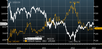 "Hay temporadas en las que a las bolsas el principal factor que las influye es el precio del crudo, hay otras en las que son los tipos de interés de los bancos centrales las que determinan su rumbo y nadie puede saber qué pasará en el futuro. Pero sí sabemos qué es lo que ha movido al Ibex los últimos 3 años: la prima de riesgo. Y es algo tan evidente que basta con una imagen (no está actualizada con la “movida” de esta semana pero sirve igual) para darnos cuenta:"