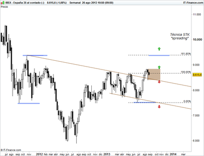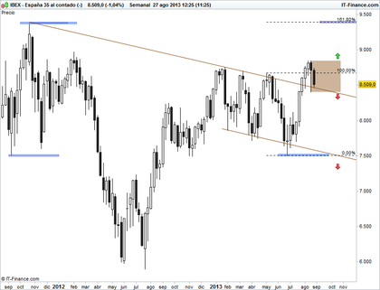 En teoría ha roto la directriz bajista en semanal, y no tengo muy claro si la figura que pones en la imagen es un hombro-cabeza-hombro invertido, si así fuese el ibex apuntaría muy alto... lo ves posible? Un saludo!