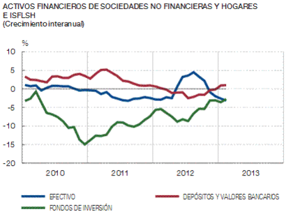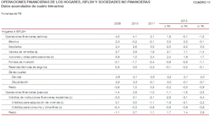 Y en relación al porcentage respecto al PIB: "[...] la inversión de los hogares en activos financieros [...] en términos acumulados de doce meses [del 2012][...] Destacó la inversión en depósitos, que concentró el grueso de los flujos en este período [...]. En contraposición, las desinversiones más cuantiosas en el conjunto del año se registraron en los valores de renta fija y en los fondos de inversión [...]."