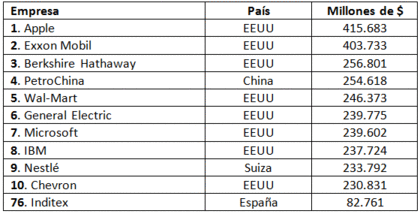Solamente cinco de las mayores empresas por capitalización que encontrábamos en 2003 aparecen ahora en 2013, estas son Exxon, Wal-Mart, GE, Microsoft e IBM. Aunque sí es cierto que Microsoft hoy en día vale menos que hace diez años. Después de su recuperación bursátil, Apple es la mayor empresa por capitalización. Hace diez año no estaba ni en las 500 primeras empresas.