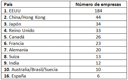 En cuanto a los países que más contribuían en números de empresas con mayor capitalización bursátil: